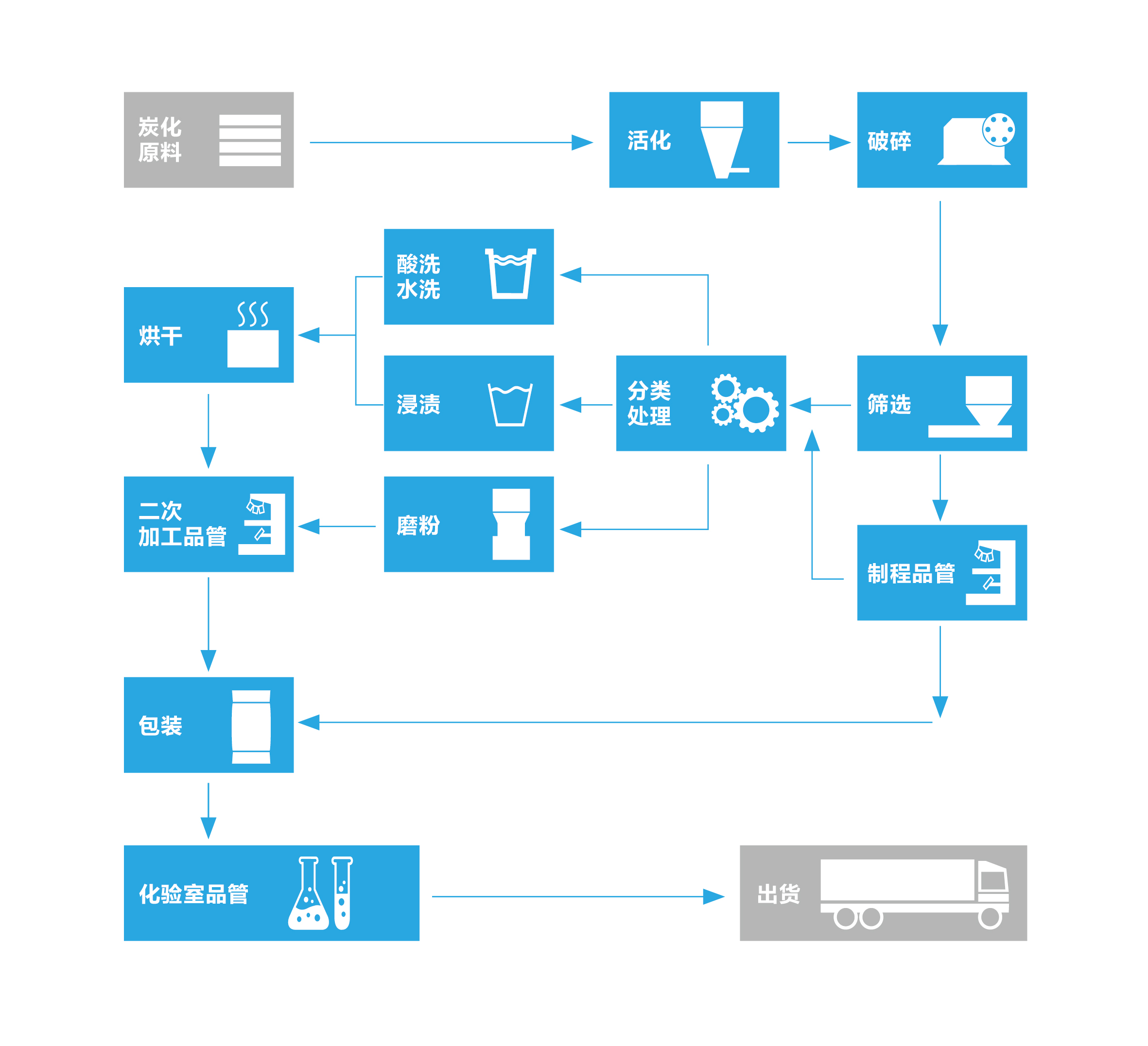 活性炭生產(chǎn)方法有兩種,化學(xué)活化法和物理活化法。 化學(xué)活化法就是通過(guò)將各種含碳原料與化學(xué)藥品均勻地混合后,一定溫度下,經(jīng)歷炭化、活化、回收化學(xué)藥品、漂洗、烘干等過(guò)程制備活性炭。 物理法通常又稱(chēng)氣體活化法,是將已炭化處理的原料在800 ~1000℃的高溫下與水蒸氣,煙道氣(水蒸氣、CO2、N2等的混合氣)、CO或空氣等活化氣體接觸,從而進(jìn)行活化反應(yīng)的過(guò)程。